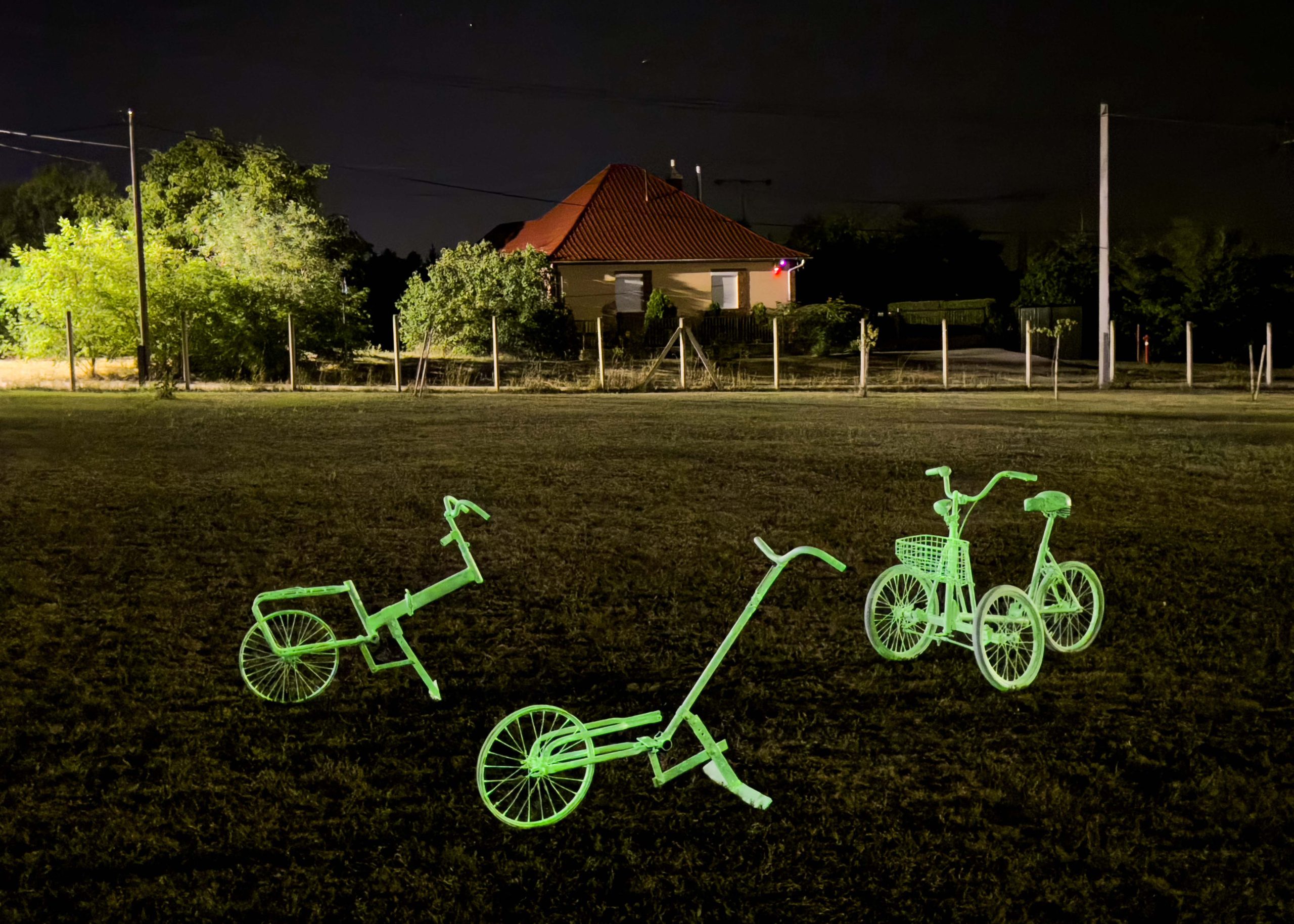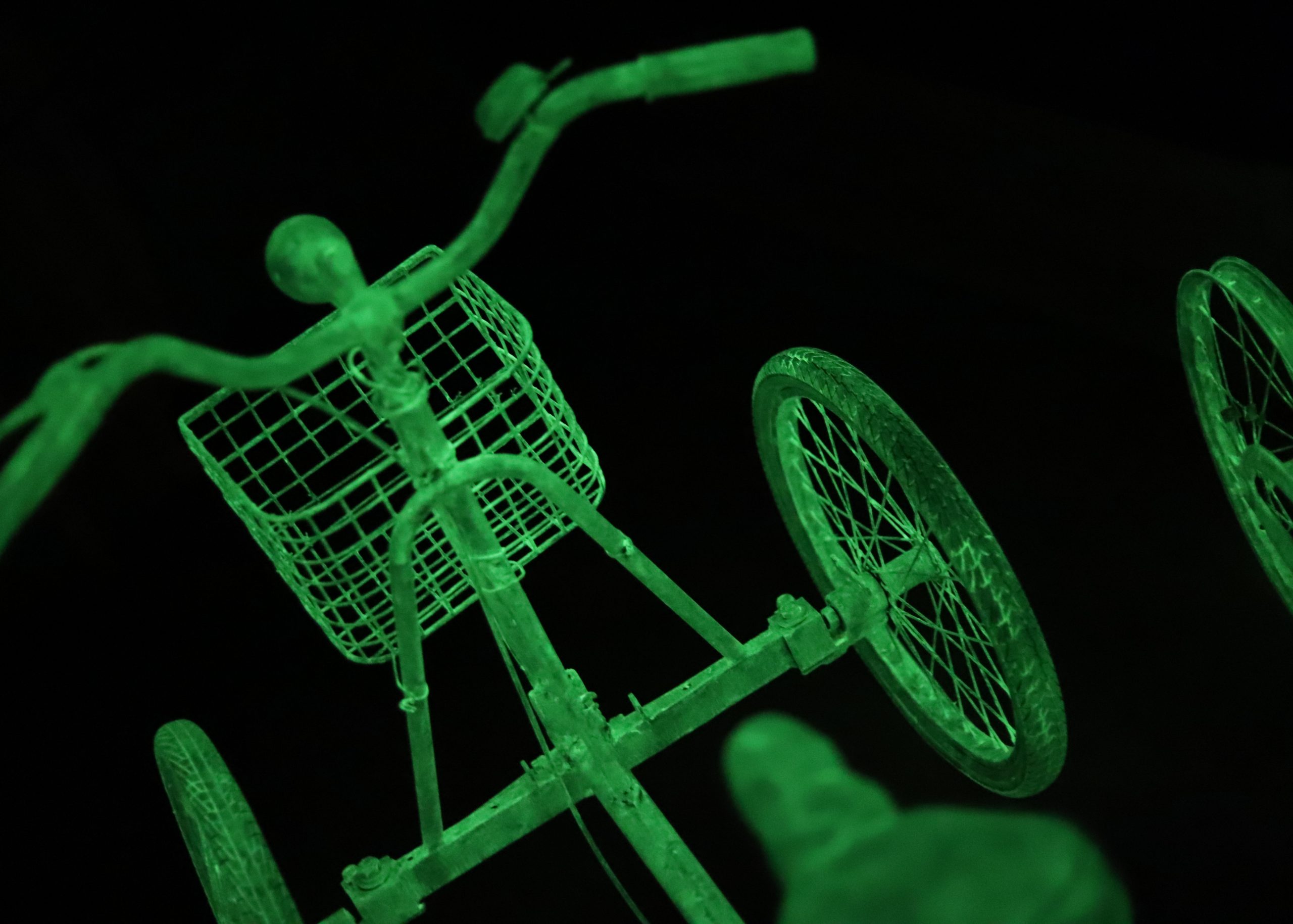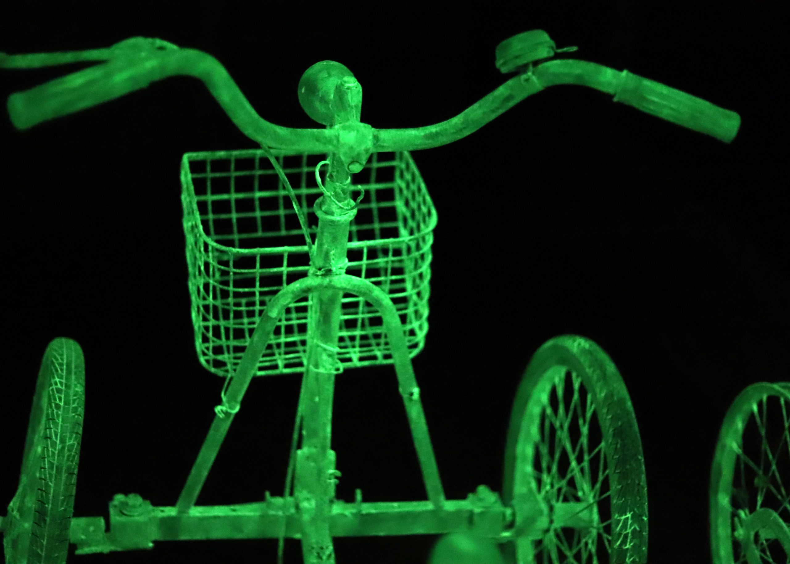 ready-made (homemade cultivator, trike), glow-in-the-dark paint