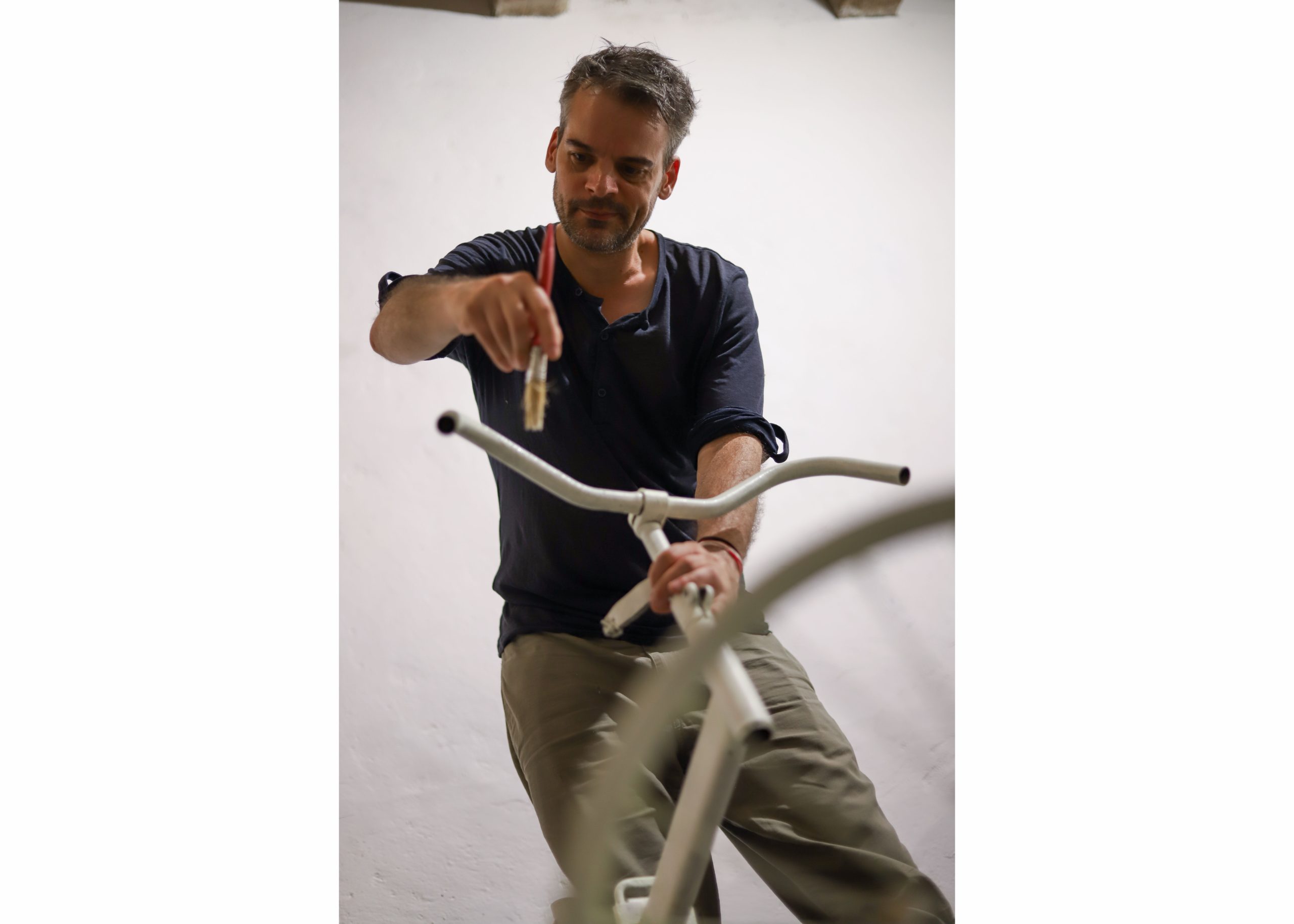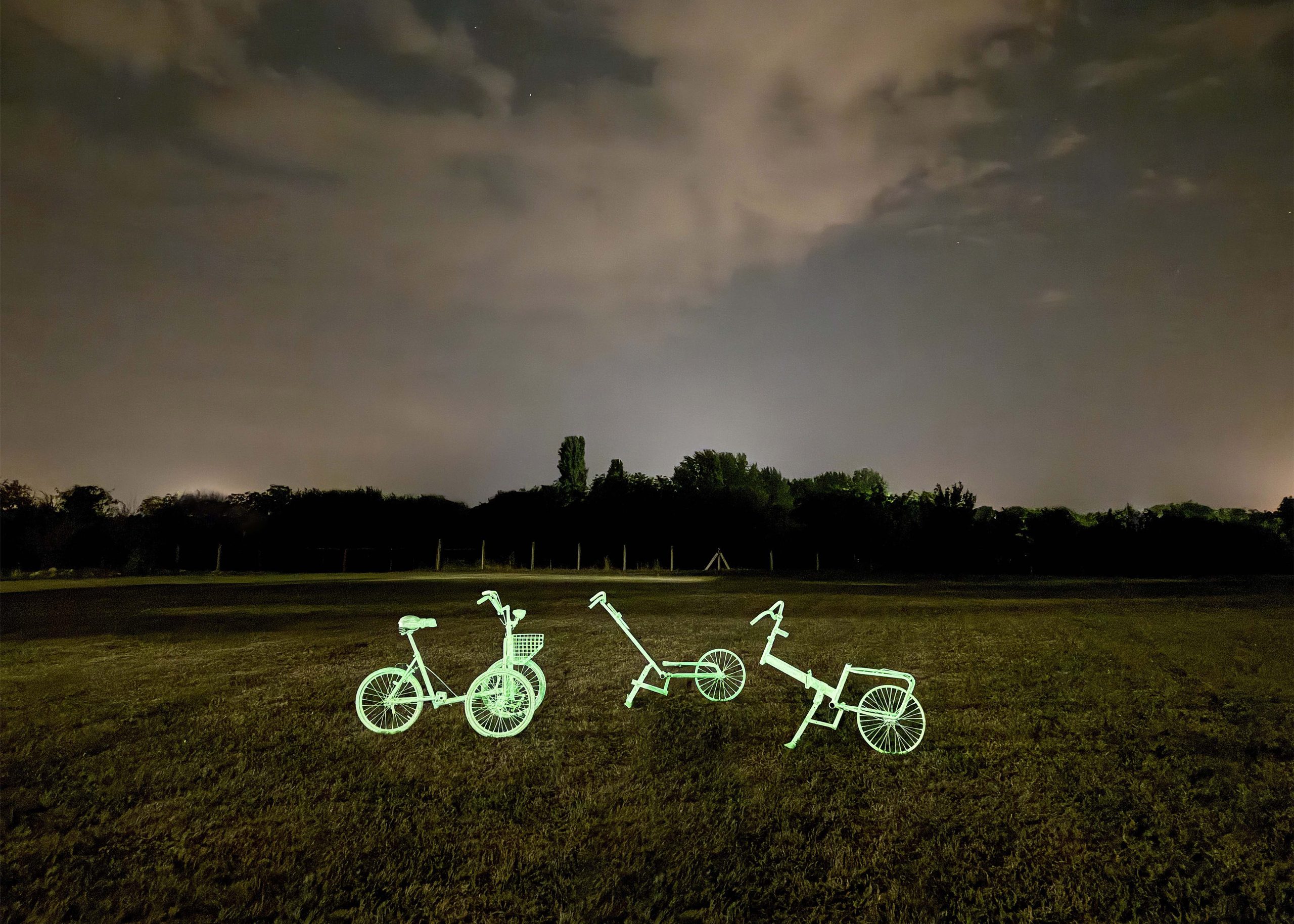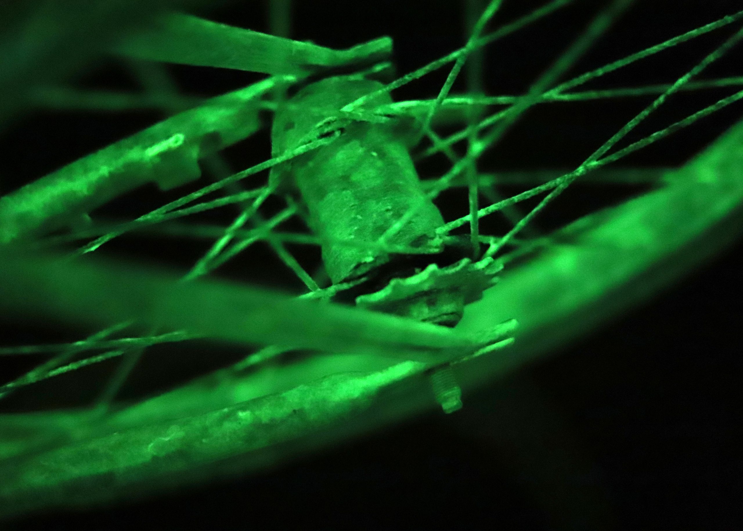 ready-made (homemade cultivator, trike), glow-in-the-dark paint